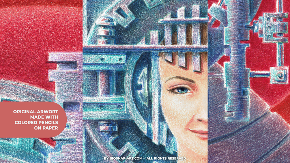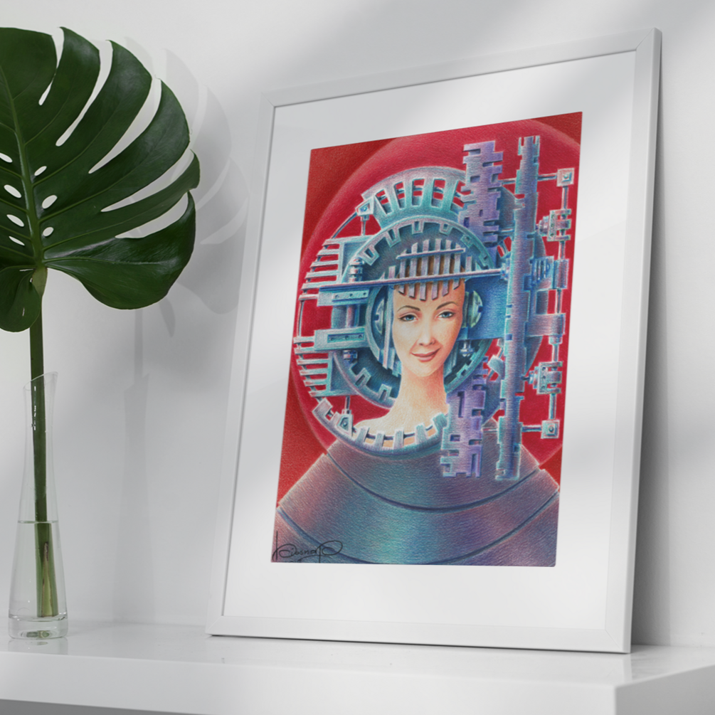 ABOUT THE ORIGINAL ARTWORK: This portrait belongs to a series of portraits I made in 2015 for my exhibition "Mechanical Delusions and other Illustrated Stories II" in Copenhagen, Denmark. The original piece was made in A3 format with colored pencils on cardboard. When you print your file out you will see the raw pencil grain. I'm usually inspired by the mashup of mechanics and humans or bionics for like +20 years, and as my work has changed to explore different media or formats of expression, the mechanic or bionics theme is always present. I have training in architectural design, so I think is constantly in the back of my head.